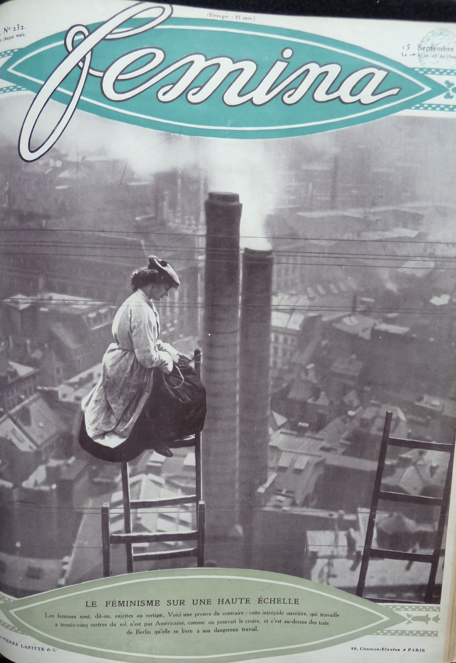 This image from a 1910 Femina cover was actually borrowed from a German magazine. The caption reads: “Women, they say, are subject to vertigo. Here’s proof to the contrary: this intrepid worker, operating at 35 meters above the ground, is not American, as one might think. It’s actually over the roofs of Berlin that she throws herself into her dangerous work.”